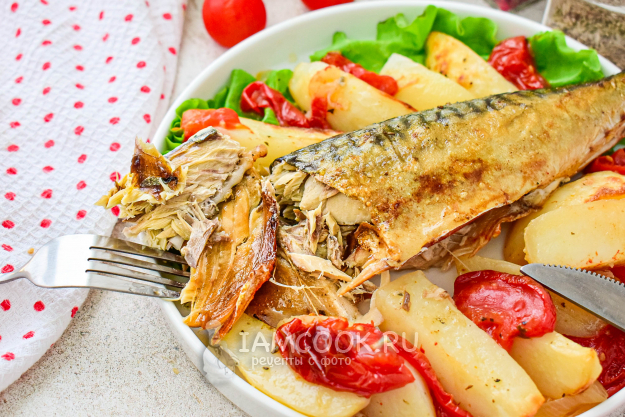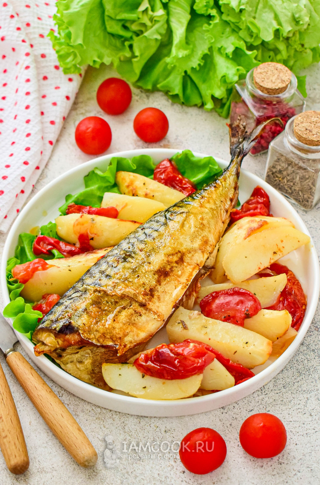 Запеченная в духовке скумбрия с картошкой и помидорами готова к подаче на стол! Извлеките форму из духовки и разложите по тарелкам.