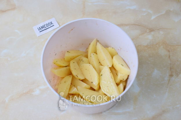Картофель нарежьте дольками и полейте растительным маслом. По вкусу добавьте соль и специи. Всё смешайте, чтобы масло равномерно покрыло картофель со всех сторон. Благодаря этому он не будет сохнуть в духовке.