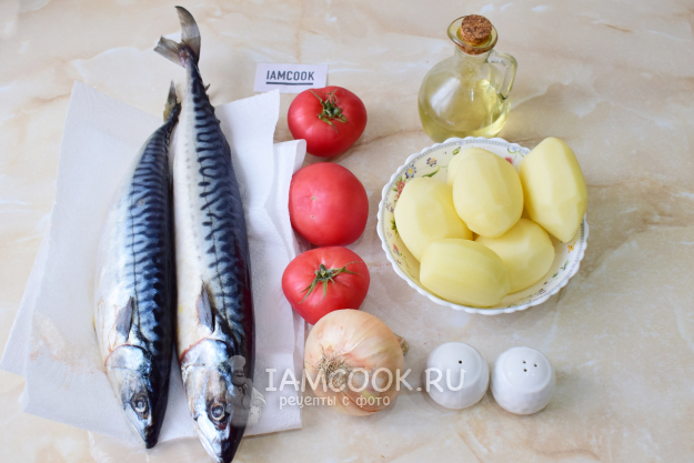 Чтобы приготовить скумбрию с картошкой и помидорами в духовке, соберите по списку необходимые ингредиенты. Пропорции можно немного изменить по своему вкусу. Картофель заранее очистите от кожуры и промойте от загрязнений.
