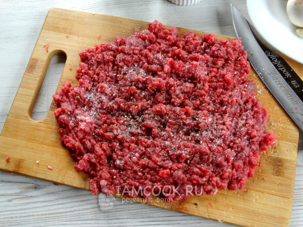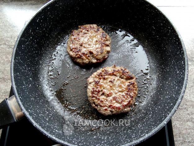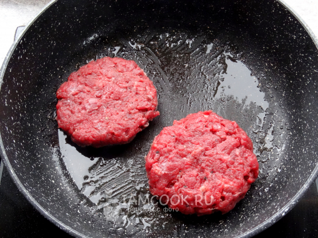 Разделить мясной фарш на две части и сформировать две толстых котлеты.