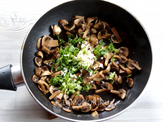 Добавить в грибы измельчённые чеснок и петрушку.