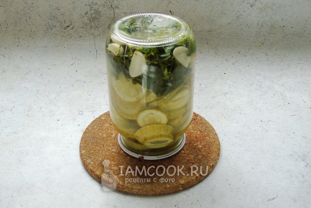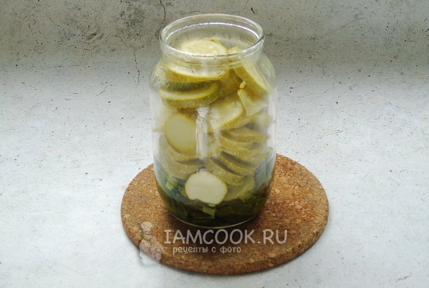 Затем разложите кабачки в банки с зеленью и чесноком.