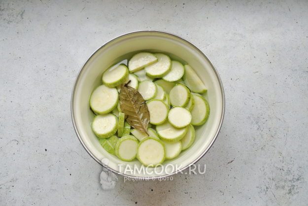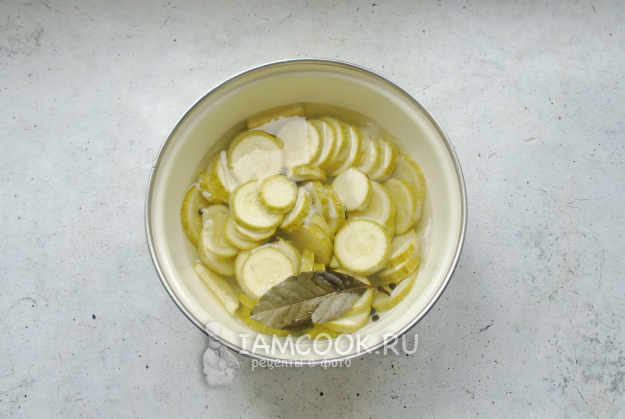 Выложите нарезанные кабачки в таз и залейте маринадом.