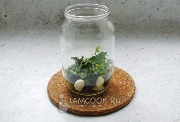 В стерилизованные литровые банки разложите зелень и зубчики чеснока.