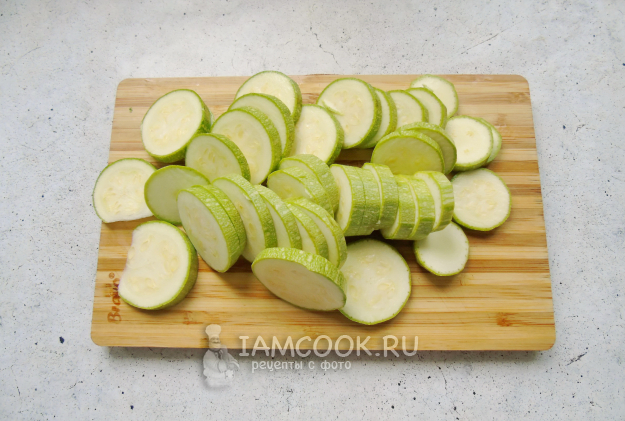 Кабачки помойте и нарежьте кружками толщиной 0,8-1 сантиметр. Крупные кружки разрежьте пополам.