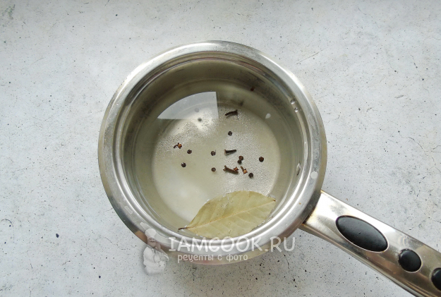 Добавьте гвоздику, черный перец горошком и лавровый лист. Маринад доведите до кипения. Перемешайте, чтобы соль и сахар полностью растворились.
