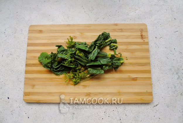 Зонтичный, созревший укроп и листья хрена хорошо помойте и обдайте кипятком. После нарежьте.