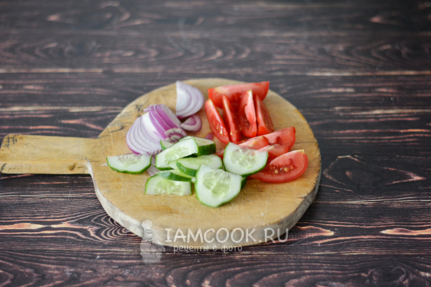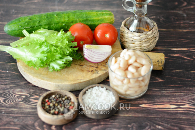 Подготовьте по списку все необходимые продукты для салата с фасолью, огурцом и помидором. Овощи вымойте, листья салата сполосните и отряхните.