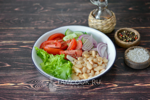 Соедините в тарелке нарезанные овощи, добавьте к ним консервированную фасоль и порванные руками салатные листья.