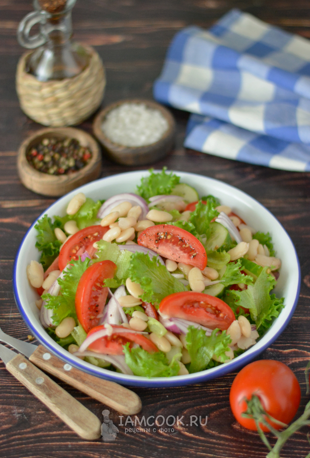 Салат с фасолью, огурцом и помидором готов. Подавайте его сразу же к столу!