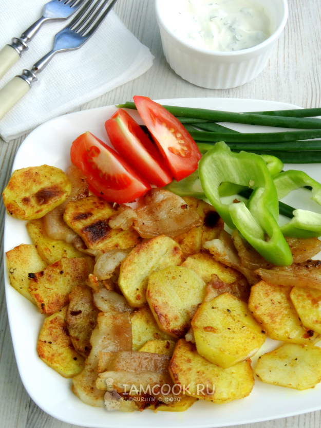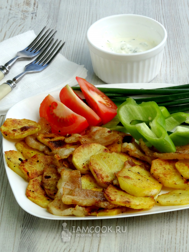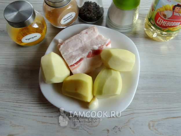Возьмите необходимые ингредиенты, чтобы приготовить картошку с салом на мангале на решетке.