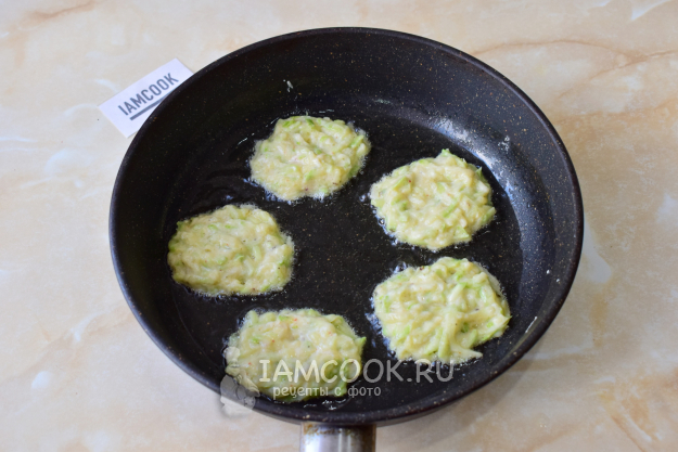 На горячую сковороду налейте растительное масло и ложкой выкладывайте кабачковую массу в виде оладий. Обжаривайте их по 2-3 минуты с каждой стороны, до золотистого цвета.