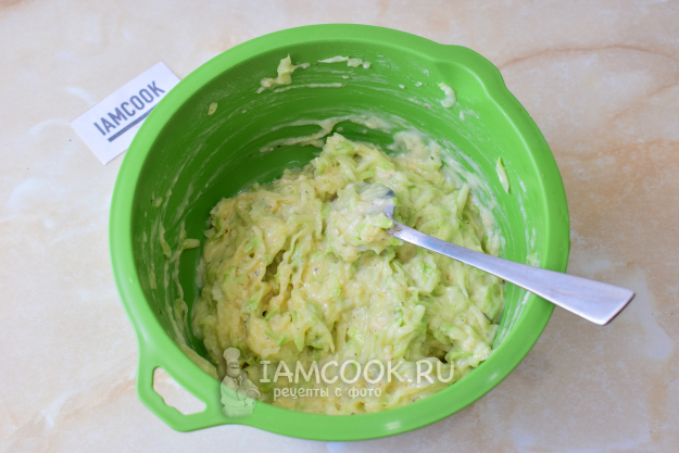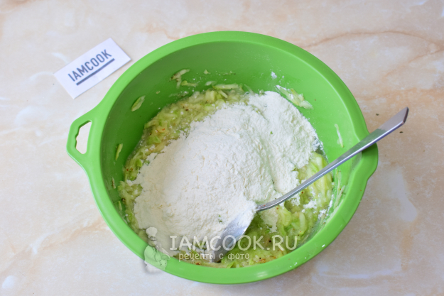 Можно добавить любимых специй. Подсыпайте в чашу муку и вмешивайте её к кабачку.