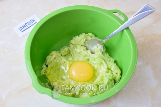 Затем переложите кабачок в чашу. Добавьте яйцо.