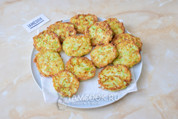 Готовые кабачковые оладьи снимайте на бумажное полотенце, чтобы пропитать с них лишнее масло.