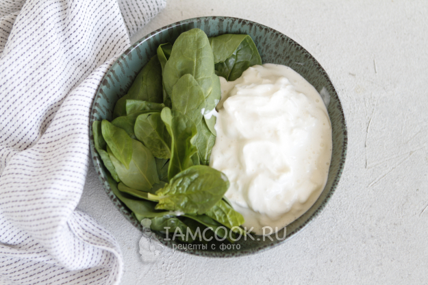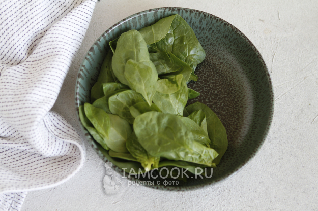 Шпинат промыть и обсушить. Стебельки удалить. Если листочки у шпината крупные, то их можно нарезать.