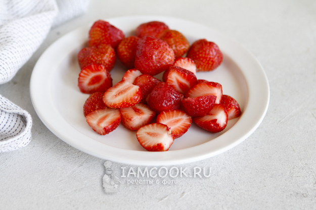 Ягода должна быть свежей и хорошего качества. Клубнику промыть под проточной водой и обсушить на бумажном полотенце. У ягод удалить плодоножки. Разрезать ягоды вдоль пополам или на четвертинки.