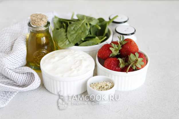 Вот такой набор ингредиентов вам понадобится, чтобы приготовить салат со страчателлой и клубникой.