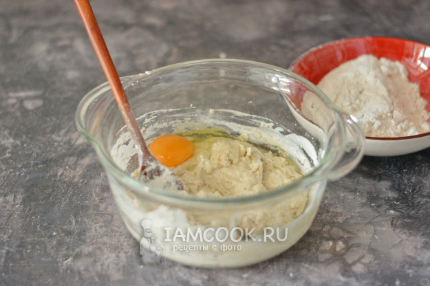 Как только заварная часть теста остыла, вбейте яйцо, вмешайте его лопаточкой в тесто.