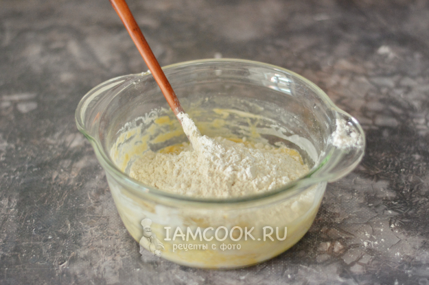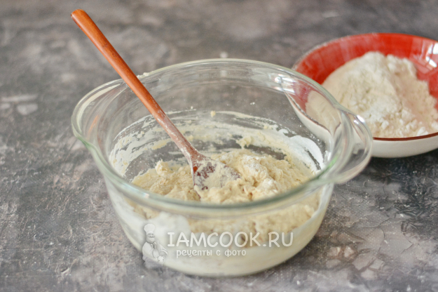 Добавьте примерно половину всей муки и начните тщательно размешивать лопаточкой.