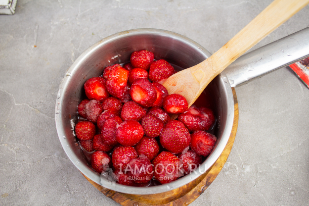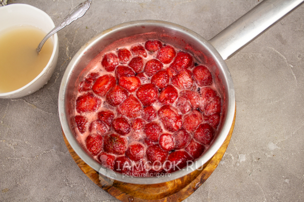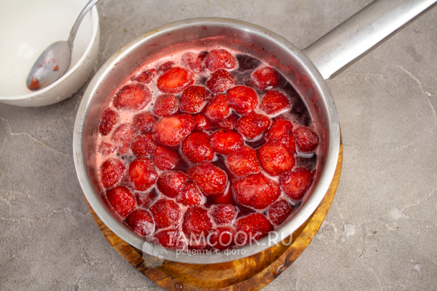 Влейте воду с агар-агаром в варенье и варите варенье из клубники при небольшом нагреве еще 5-7 минут.