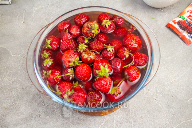 Переберите ягоды, испорченные и мягкие удалите. В посуде смешайте 2 литра холодной воды с 1 чайной ложкой пищевой соли. Выложите в этот раствор клубнику, не очищая от плодоножек (чтобы ягоды не напитались лишней влаги), и оставьте на 10 минут. Я замачиваю клубнику в содовом растворе, чтобы избавиться от остатков вредных веществ. Вы же можете поступать, как считаете нужным. Сода является естественным очистителем, который помогает удалять остатки пестицидов и грязи с поверхности продуктов - как утверждают ученые.