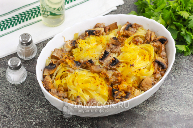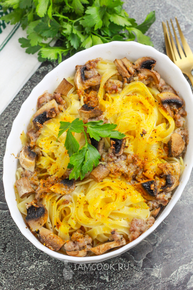 Подайте макароны с грибами и фаршем к столу прямо в форме. Можно дополнить блюдо различными соусами, сметаной, измельченной свежей зеленью.