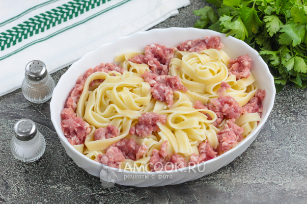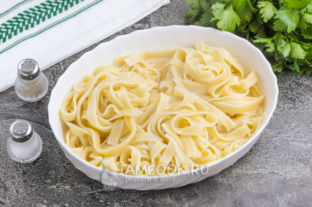Вскипятите воду в кастрюле или ковше и посолите ее. Отварите макароны-гнезда примерно 8-10 минут, практически до готовности. Я пробовала сделать это в духовке под фольгой - получается не то! Гнезда слегка разварятся - это нормально. Выложите их шумовкой в форму.