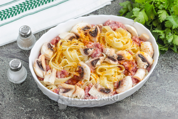 Промойте шампиньоны в воде, разрежьте на 4-6 частей и выложите в форму. Присыпьте все приправой. Жидкость добавлять не нужно - фарш и грибы ее выделят и макароны ею пропитаются.