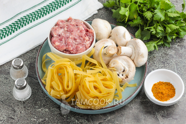 Продукты для приготовления гнезд из макарон с фаршем и грибами в духовке - перед вами!