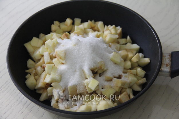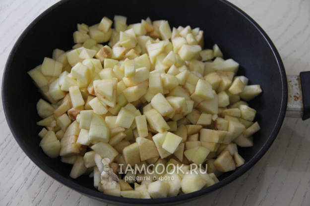Приготовить начинку. Яблоки помыть, очистить и нарезать на кубики 1,5x1,5 см. В сковороду выложить масло и разогреть. Добавить кубики очищенного яблока.