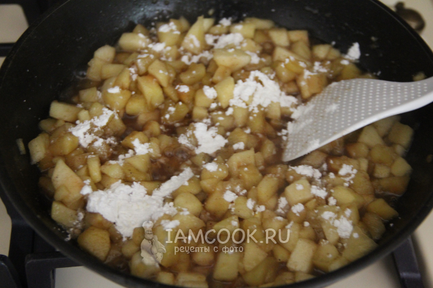 Всыпать крахмал и перемешать яблочную начинку. Варить пару минут, до загустения.