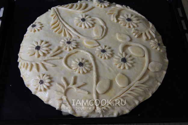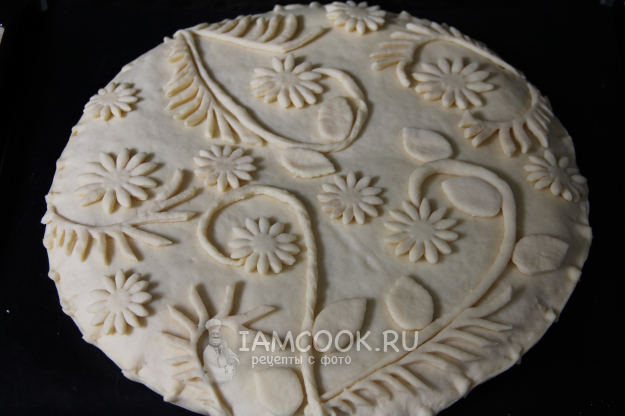 Скрепить края теста. Из теста сделать украшения и выложить поверх пирога.
