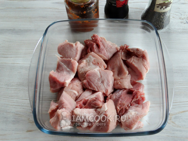 Окорок или лопатку надо нарезать крупными кусочками. Если берёте шею, то её можно сделать и средними или небольшими кусочками.