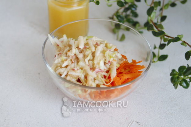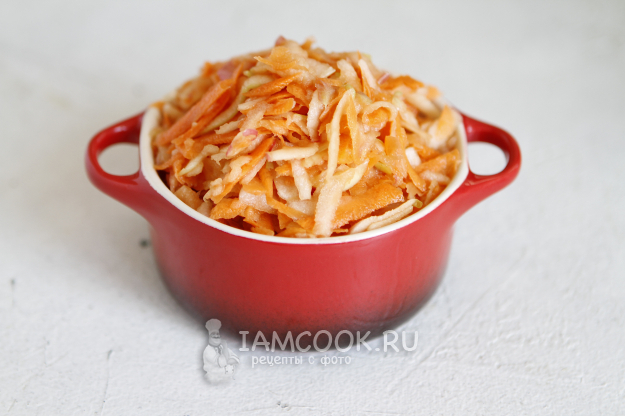 Следом натрите яблоки, удалив сердцевину и косточки, или нарежьте их мелкой соломкой.
