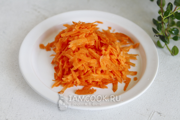 Очищенную морковь натрите на терке. Можно нашинковать ее с помощью комбайна мелкой соломкой.