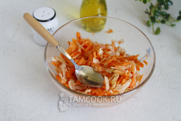 Морковь и яблоки переложите в салатник и сразу же добавьте лимонный сок. Сок мы добавляем для того, чтобы яблоки не сильно почернели. В салате такие яблоки не всегда выглядят аппетитно.