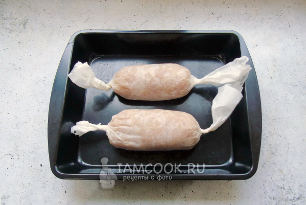 Так же поступите со второй порцией фарша. Выложите колбаски в форму для запекания. Разогрейте духовку до 85-100 градусов.