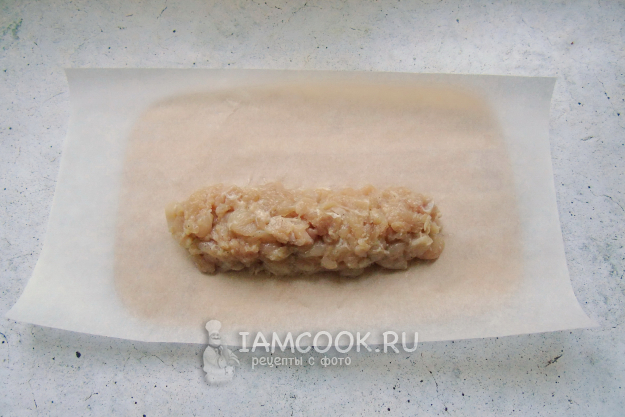 За 2 часа до начала приготовления ветчины достаньте фарш из холодильника. После разделите фарш на две части. Одну часть возьмите в руки, смоченные в воде, и хорошо отбейте о ладони, перекладывая из одной руки в другую. Таким образом вы максимально удалите воздух из фарша. Отрежьте кусок пергамента размером 25х40 сантиметров. Из фарша сформируйте колбаску длиной 17-18 сантиметров и выложите на пергамент.