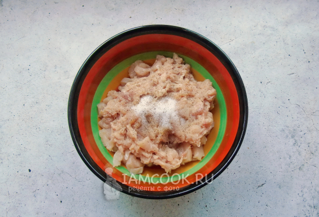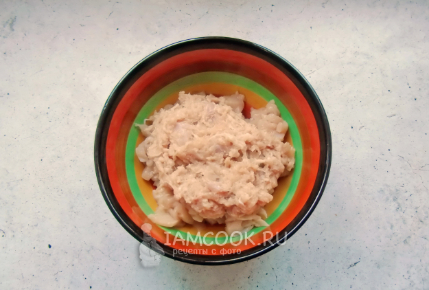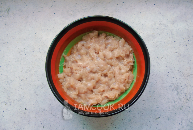 Филе бедер без кожи нарежьте кусочками крупнее и пропустите через мясорубку или измельчите в блендере. Вы получите густой однородный фарш. Добавьте его в миску с филе грудки.