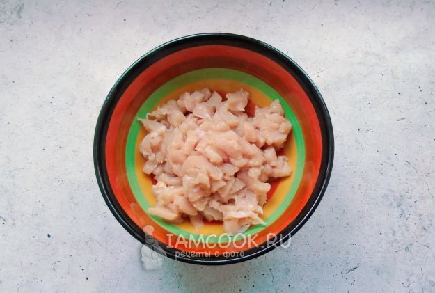 Филе куриной грудки нарежьте небольшими кусочками и выложите в миску.