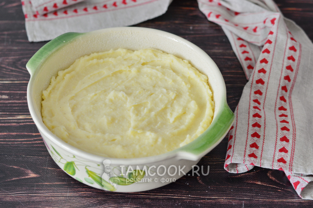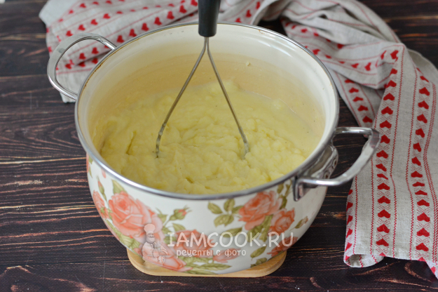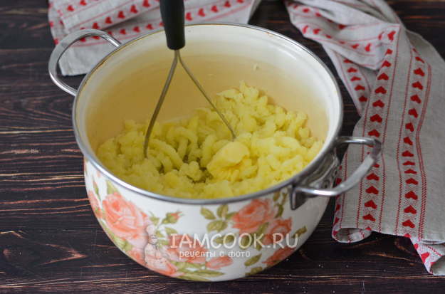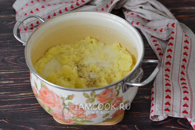 К картофельному пюре добавьте смесь сливок с яйцами, посолите и поперчите по вкусу.