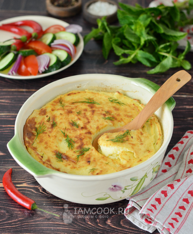 Если будете запекать не в горшке, а в форме, то выбирайте форму глубокую, чтобы слой картофеля был потолще, так гуленник будет нежнее.