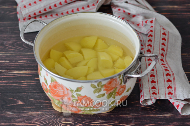 Картофель нарежьте на четвертинки и залейте водой. Варите на среднем огне примерно 25-30 минут, до полной мягкости.