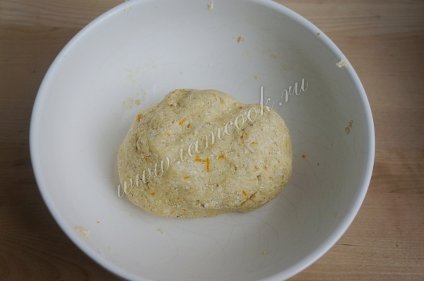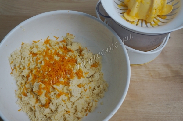 С апельсина снять цедру (на мелкой терке) и выложить ее в тесто. Выжать сок.