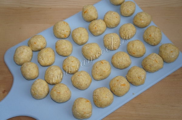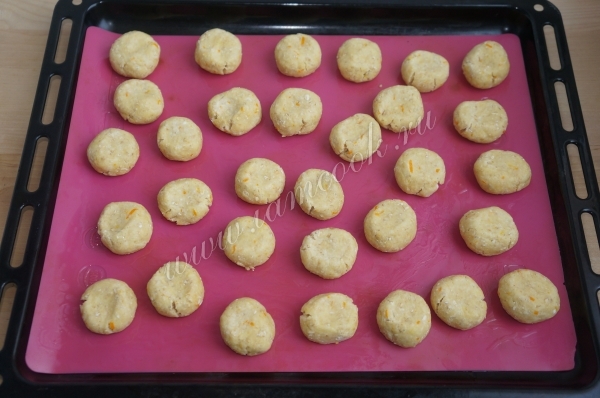 Духовку нагреть до 180 градусов. Противень застелить пергаментной бумагой или силиконовым ковриком. Слегка смазать растительным маслом. Остывшие шарики выложить на противень и приплюснуть, придав форму печенья.