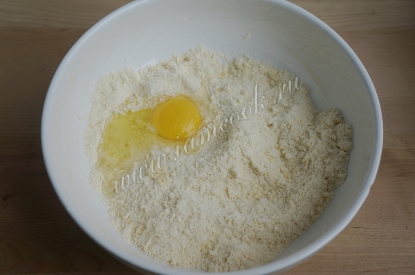 Холодное масло покрошить небольшими кусочками и руками растереть тесто в крошку. Вбить яйцо.