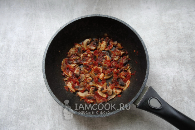 Тушите грибы с помидором 5-7 минут, перемешивая, до испарения жидкости.