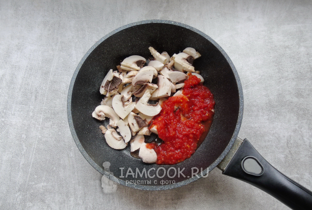 Шампиньоны очистите, помойте и нарежьте произвольно. Выложите на сковороду с подсолнечным маслом. Помидор измельчите в блендере или в мясорубке. Добавьте к грибам.
