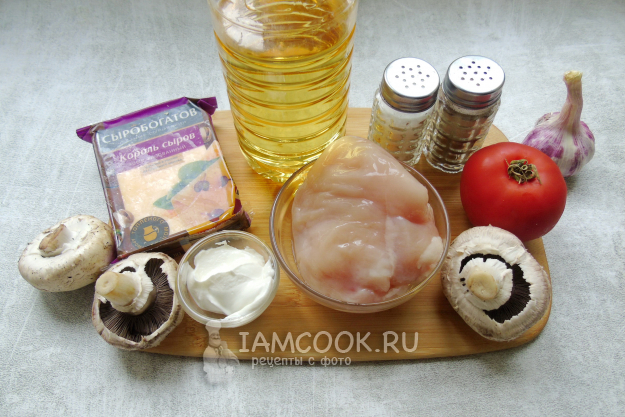 Соберите ингредиенты для приготовления закуски с курицей и грибами.